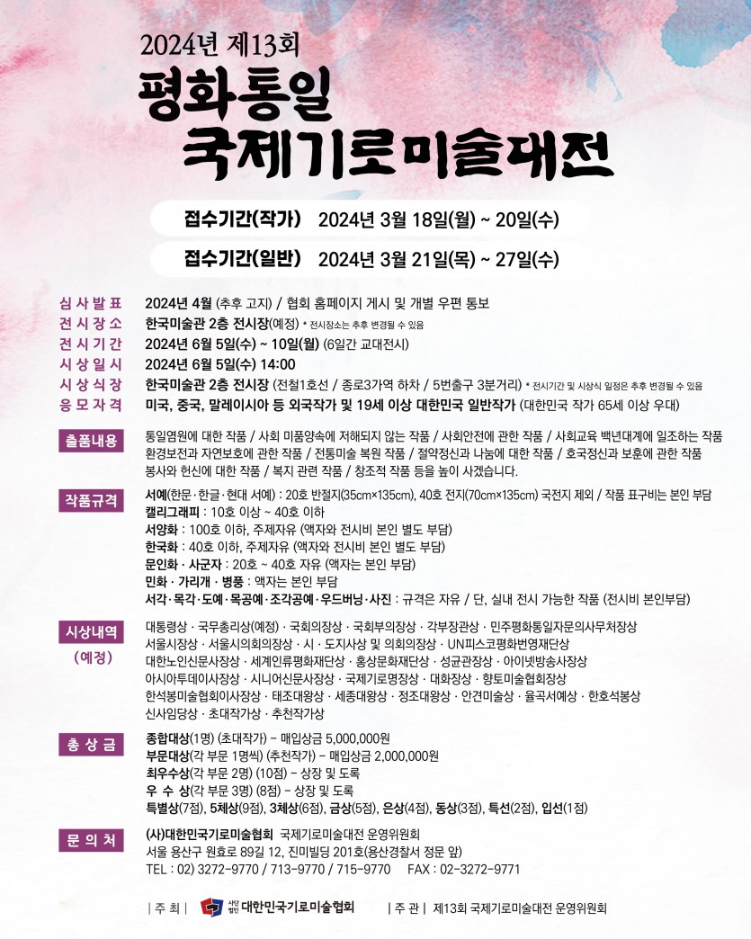 2024 제13회 평화통일 국제기로미술(서화)대전 공모